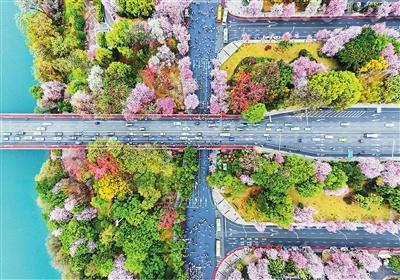 柳州街头,街道旁、公园里、江岸边,层层叠叠的花瓣交织成一条条花海长廊。粉的似霞,白的如雪,与江水和城市建筑交相辉映,构成一幅“城在花中,花在城中”的立体画卷。市民游客漫步花下,畅享春日之美。