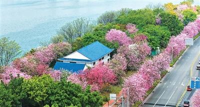 柳州街头,街道旁、公园里、江岸边,层层叠叠的花瓣交织成一条条花海长廊。粉的似霞,白的如雪,与江水和城市建筑交相辉映,构成一幅“城在花中,花在城中”的立体画卷。市民游客漫步花下,畅享春日之美。